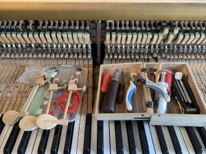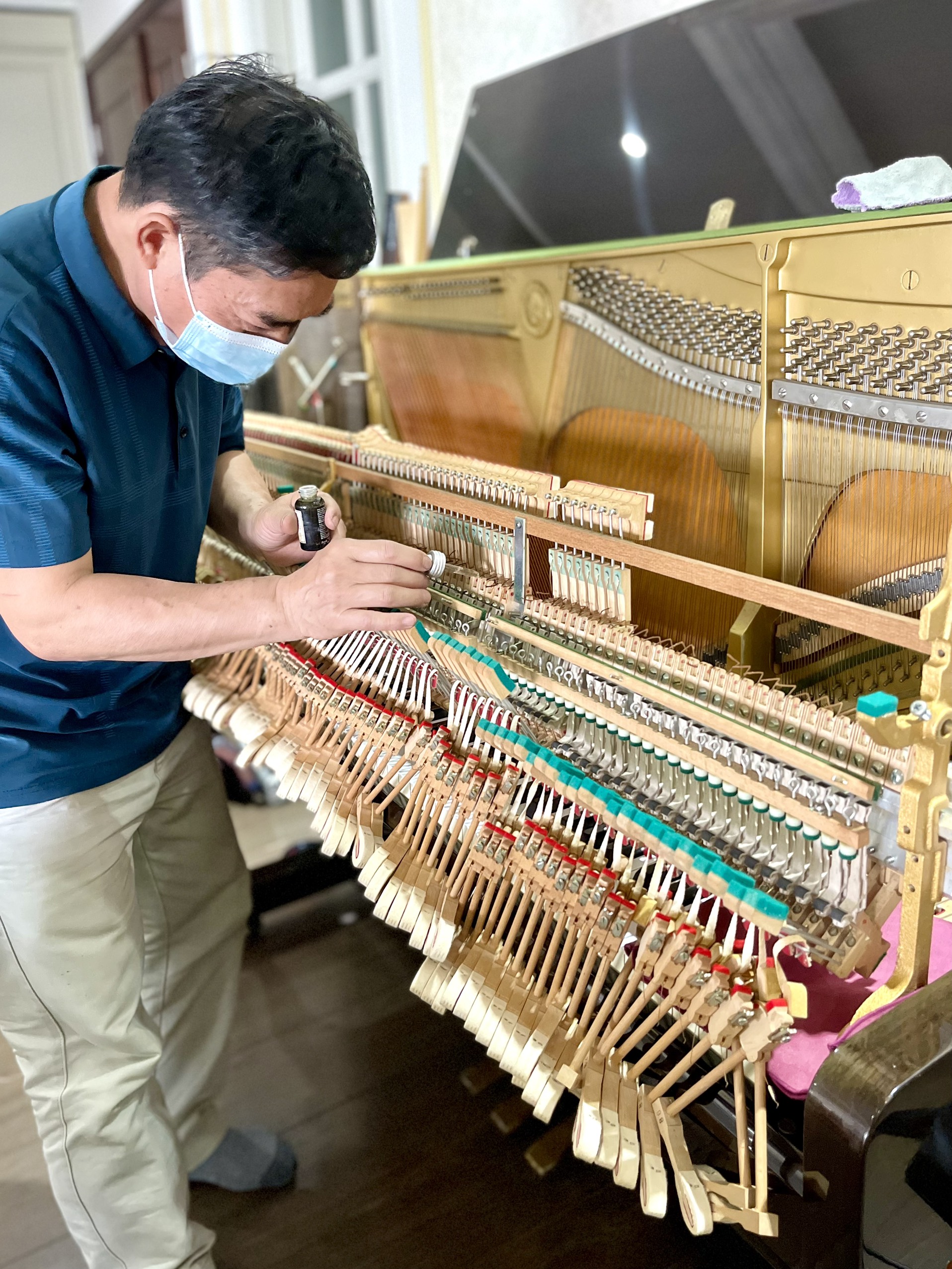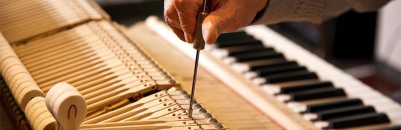 2. Căn chỉnh, bảo dưỡng máy: Các chi tiết máy phần nhiều làm từ gỗ, dạ. Thời tiết làm nó co giãn, cong vênh và trở nên sai lệch, vì vậy nó hoạt động sai, đáp ứng chậm… Người chơi sẽ cảm thấy khó chịu trong việc điều khiển và điều này ảnh hưởng không chỉ kỹ thuật chơi mà cả cảm xúc chơi đàn. Căn chỉnh, bảo dưỡng máy là việc điều chỉnh, kê nắn cho các chi tiết máy trở về đúng vị trí, làm trơn các chỗ kẹt và làm khít các chỗ rơ. Công tác kiểm tra được tiến hành tới từng nốt trên toàn bộ phím đàn.