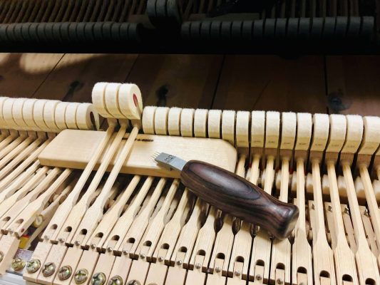 – Các đầu búa (Hammers) nếu bị mòn vừa phải có thể chà đi để loại bỏ các rãnh do dây đàn hằn lên. Tiếp đó đầu búa được chỉnh để tiếp xúc vuông vắn với dây đàn.