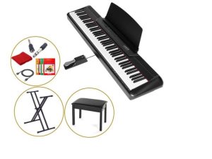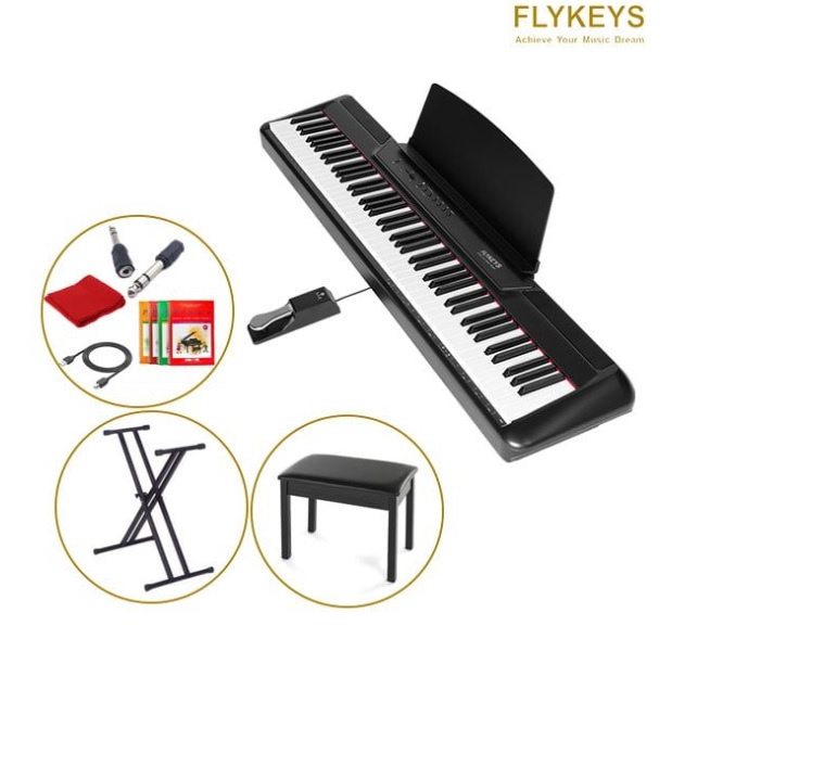 – Tặng bộ phụ kiện :Ghế piano, chân đàn kép chữ X, khăn phủ phím, giáo trình piano online, dây cáp kết nối, giắc cắm chuyển đổi tai phone.