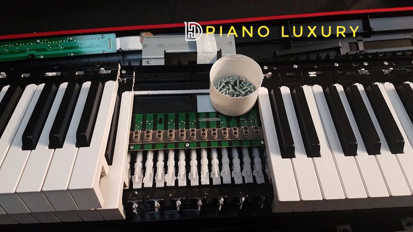 - Đàn Yamaha :Khung phím bị gãy,lão hoá đến chảy nước, hiện tượng phím bị kẹt theo từng mảng.Cách xử lý : Thay khung phím.